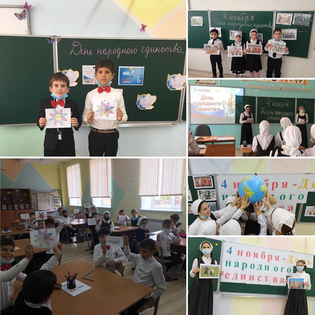 В преддверии Дня народного единства в МБОУ «Гудермесская СШ №12 им. А. А. Кадырова» прошли тематические мероприятия, объединённые одной темой – «День народного единства». В ходе мероприятий дети в доступной форме познакомились с историей возникновения праздника, подвигами наших предков во имя независимости Родины. Ребята вспомнили о том, как велика и красива наша Родина, как богата событиями её история, закрепили свои знания о государственных символах.